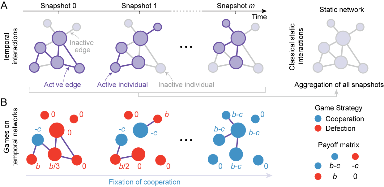 在传统群体智能行为研究中,系统中智能个体间的博弈交互结构通常被简化为不随时间变化的静态复杂网络。然而在实际系统中,个体之间的博弈交互结构往往处于动态演化中,且可发生在两个体或多个体之间(图1)。如何揭示动态网络化博弈场景中群体智能行为的演化机理、调控群体博弈策略的演化,是当今系统科学、博弈论、控制理论、人工智能等前沿交叉科学研究中的开放性难题。
