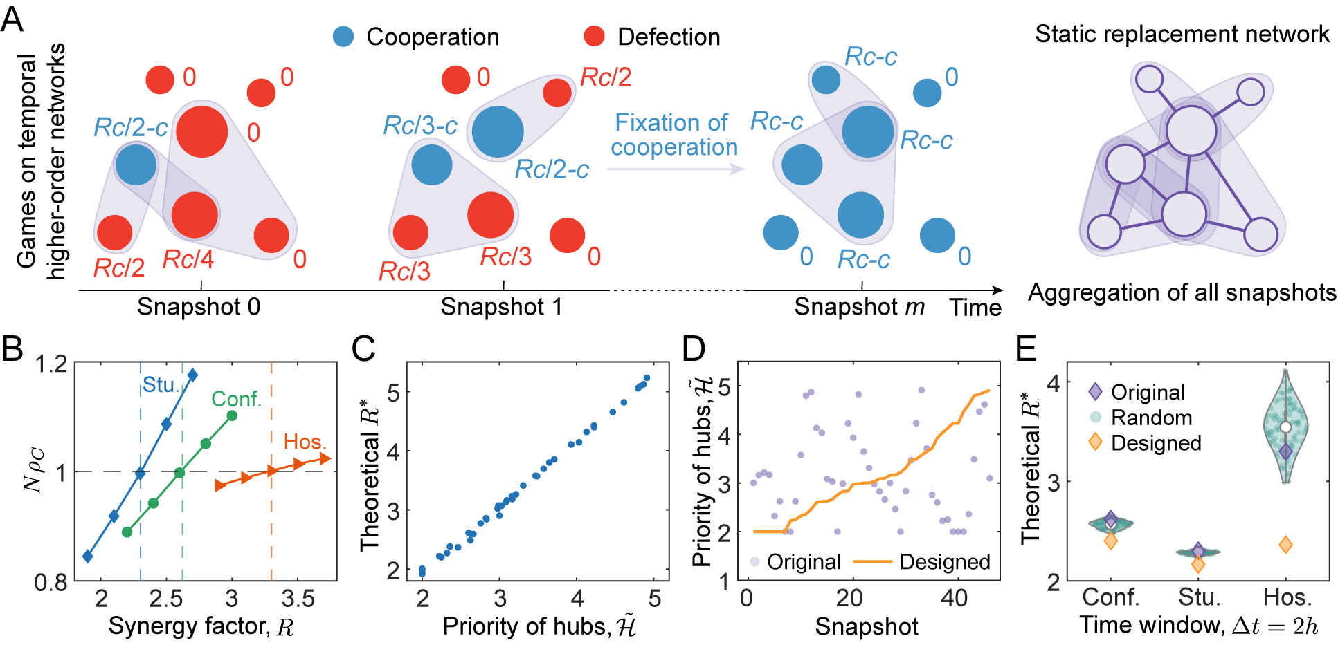 进一步,他们发现为促进群体最优策略演化,应降低博弈对象较多的个体在动态博弈中的交互优先级。基于此,他们提出了调控动态网络上群体最优策略演化的方法,并建立了定量刻画个体交互优先级的指标,用以优化和设计真实动态场景中的博弈对象和博弈顺序。他们同时验证了该方法在更为一般的高阶动态网络(图2A)和基于真实交互数据所构建的动态网络(图2B-E)上的有效性。